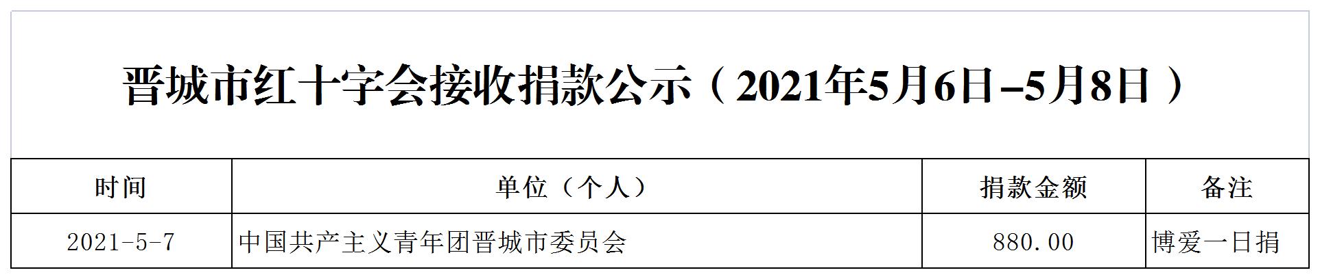 晋城市红十字会接收捐款公示(2021年5月6日-5月8日)