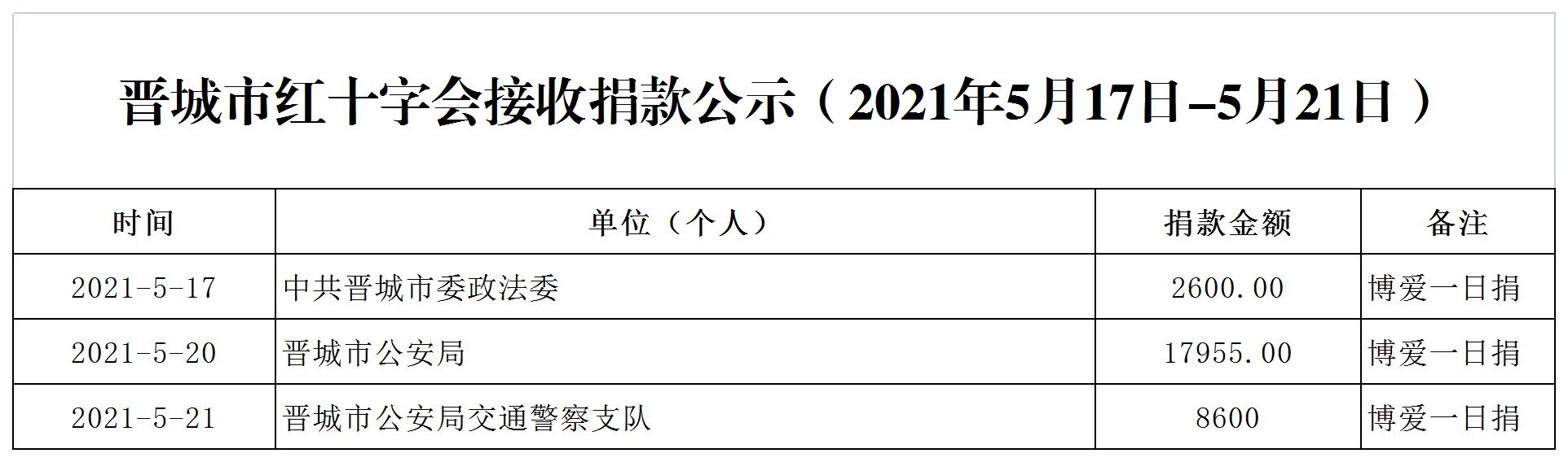 晋城市红十字会接收捐款公示(2021年5月17日—5月21日)