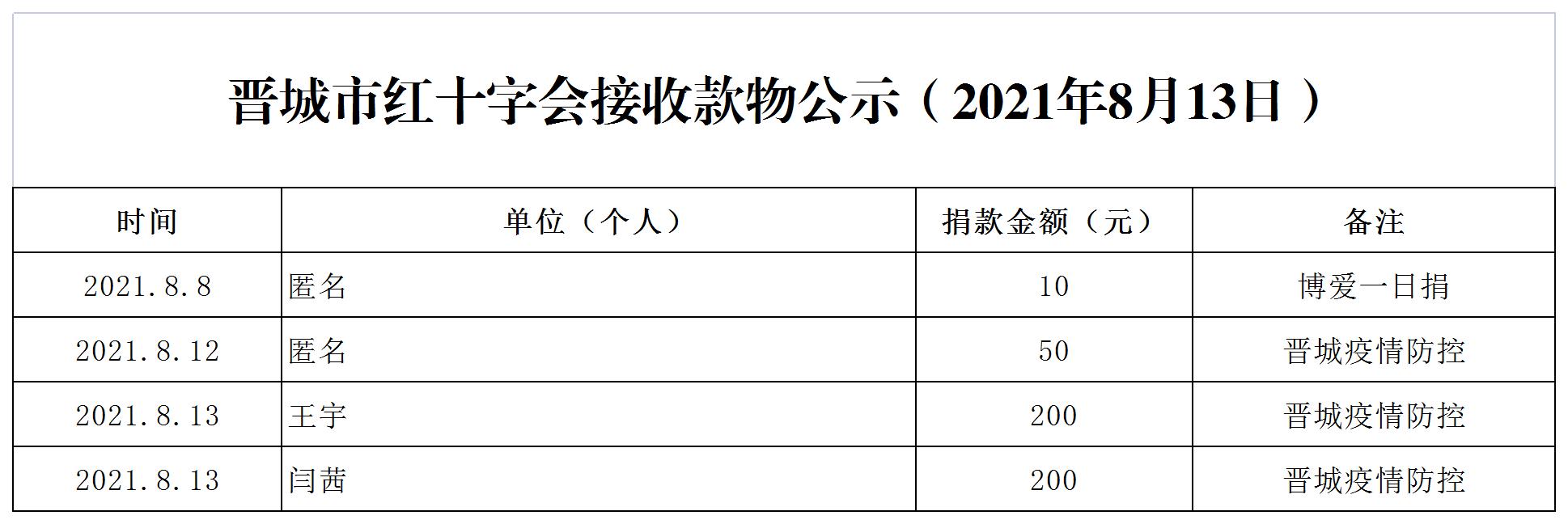 晋城市红十字会接收捐款公示(2021年8月13日)