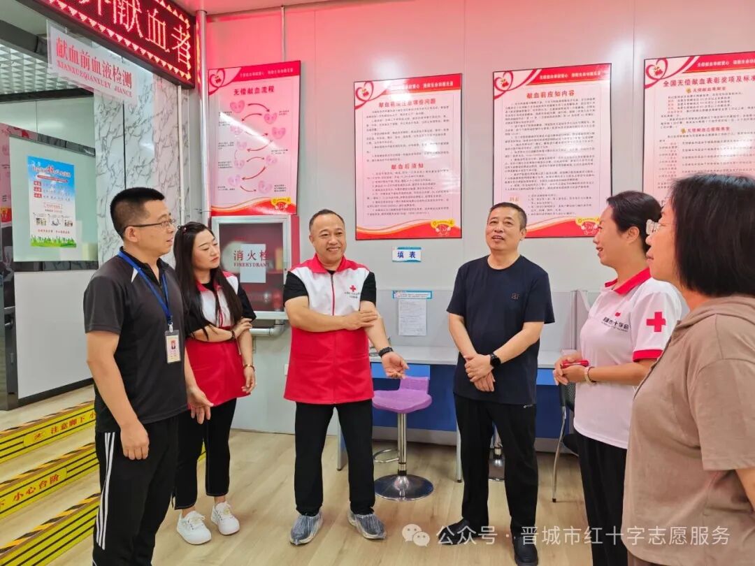 晋城市红十字会党组成员、副会长刘晋宇与党支部副书记、四级调研员司林霞来到市中心血站,为坚守在这里的红十字志愿者送来节日的祝福和感谢,对志愿者无私奉献的精神给予高度赞扬。