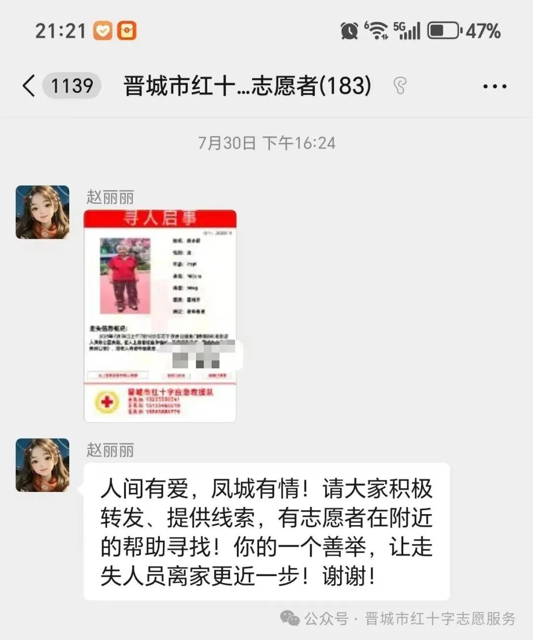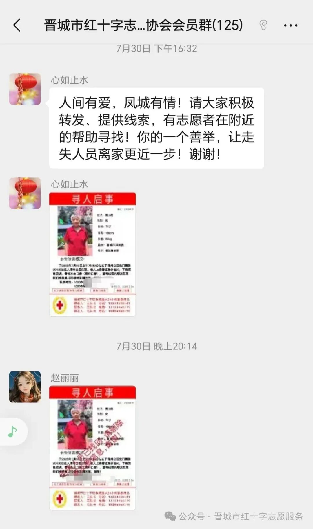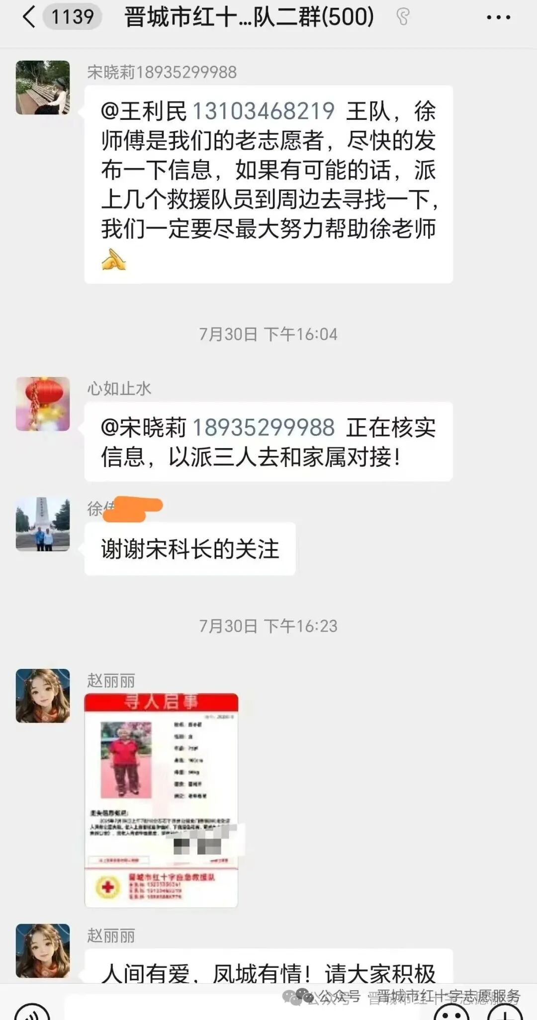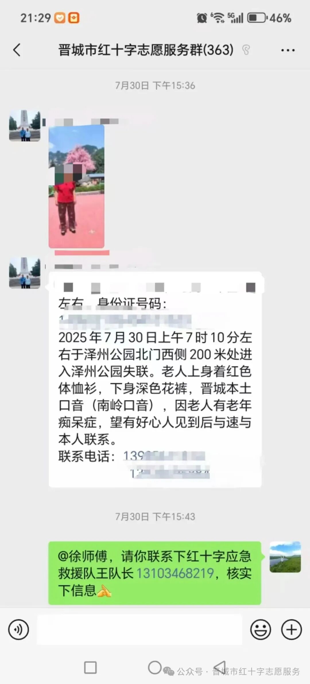 7月30日15时30分,一条紧急求助信息打破了晋城市红十字志愿者群的宁静。志愿者徐师傅的爱人(患有阿尔茨海默症)不幸走失!消息就是命令,时间就是生命。红十字应急救援队闻讯立即启动应急响应机制,一场争分夺秒的爱心搜寻火速展开。