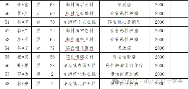 根据《沁水县红十字会特殊困难群众临时救助实施意见》,为切实保障困难群众温暖过冬,体现红十字会“人道、博爱、奉献”的精神,经乡(镇)红十字会初审,县红十字会审核,拟对58名因病困难家庭进行救助,现将救助名单公示如下,望社会各界监督,如有公示人员情况不属实的,请在7日(2025年12月24日-2025年12月30日)内向县红十字会反映。反映情况要实事求是,以书面等形式提出,对线索不明和匿名反映的,不予受理。