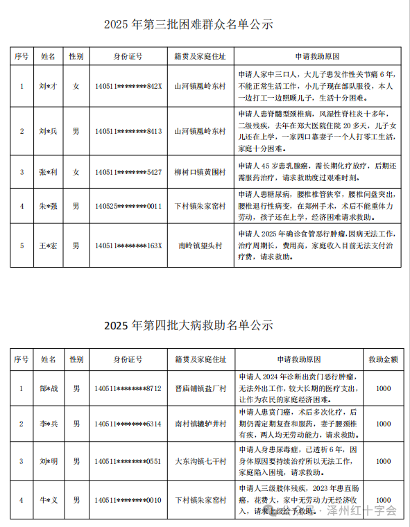 泽州县红十字会2025年第三批博爱助困及第四批大病拟救助名单