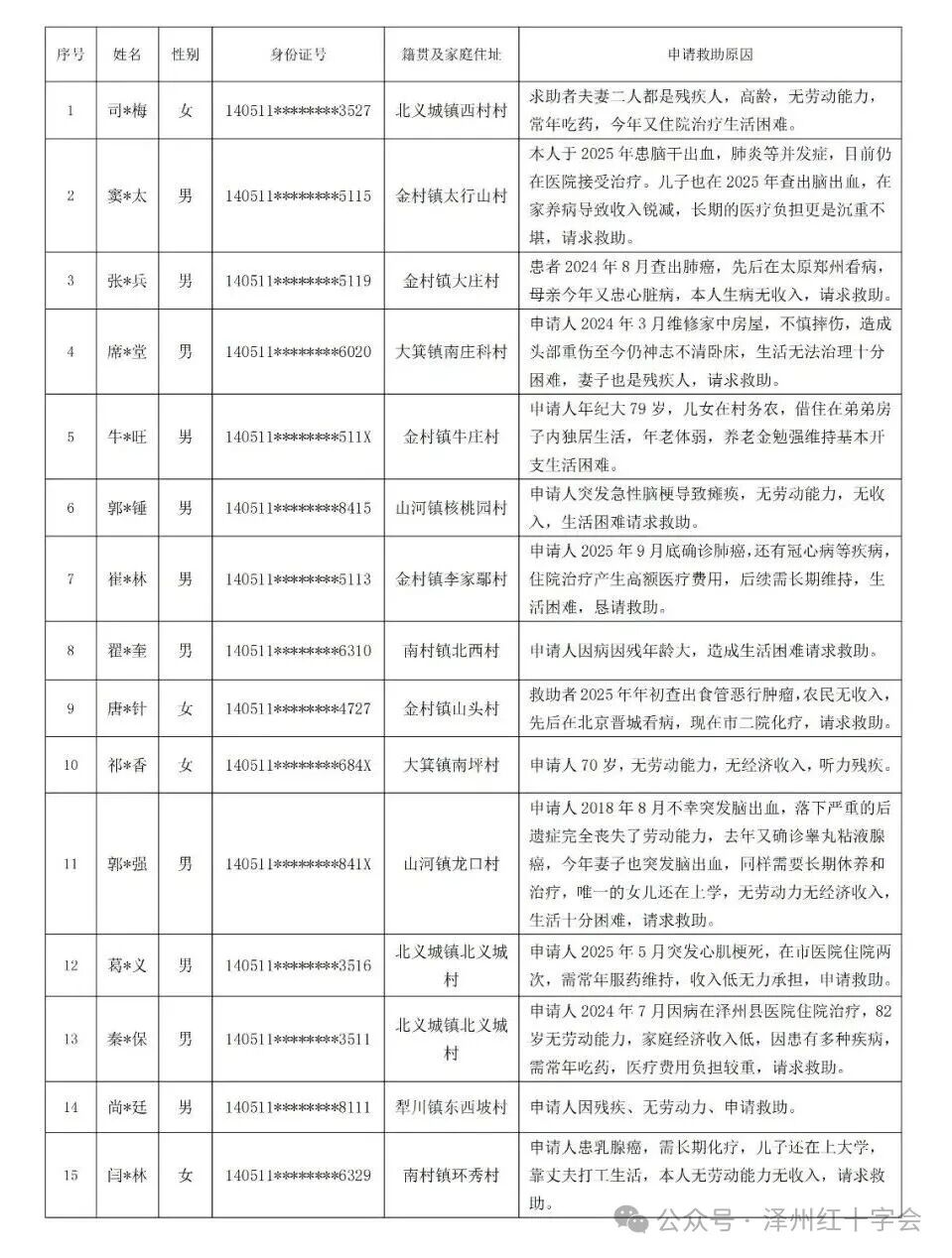 泽州县红十字会2025年第二批博爱助困拟救助名单