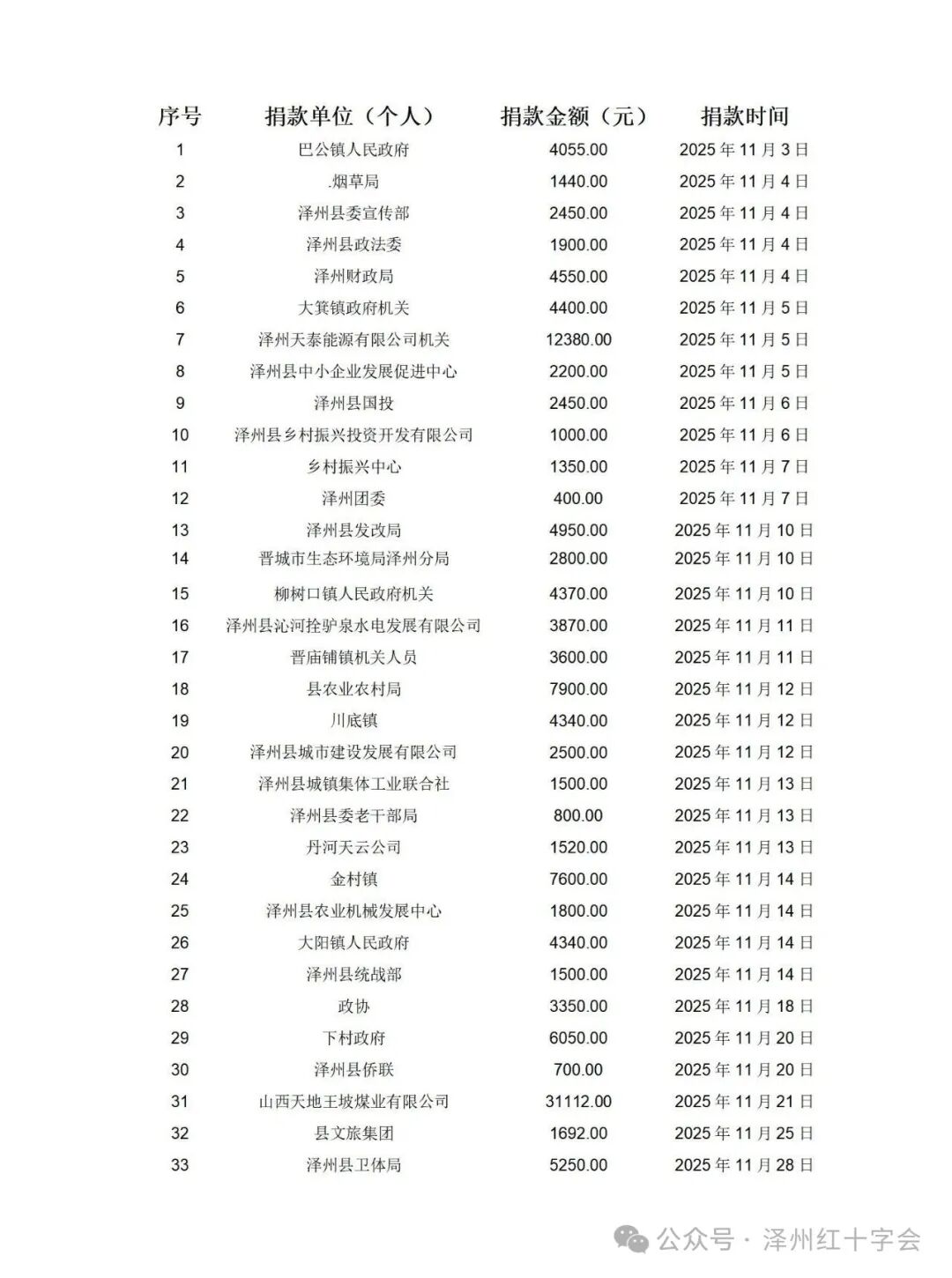 为公开、透明开展捐赠活动,更好的接受社会各界的监督,现将泽州县红十字会2025年接受社会各界爱心捐赠款物情况公示如下(时间起止:2025年11月1日至2025年11月30日)