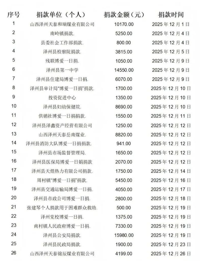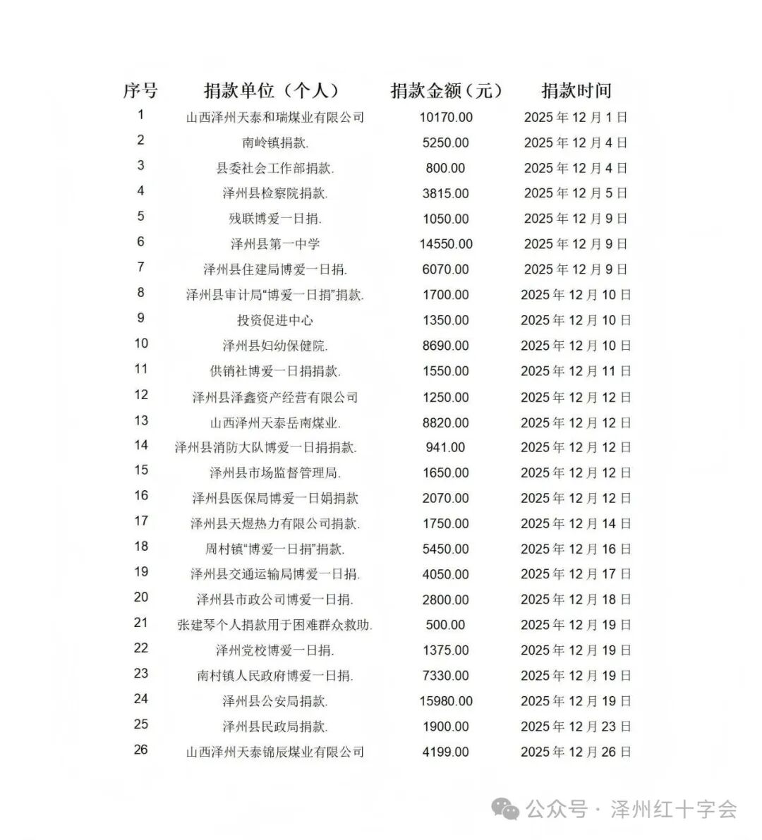 为公开、透明开展捐赠活动,更好的接受社会各界的监督,现将泽州县红十字会2025年接受社会各界爱心捐赠款物情况公示如下(时间起止:2025年12月1日至2025年12月31日)
