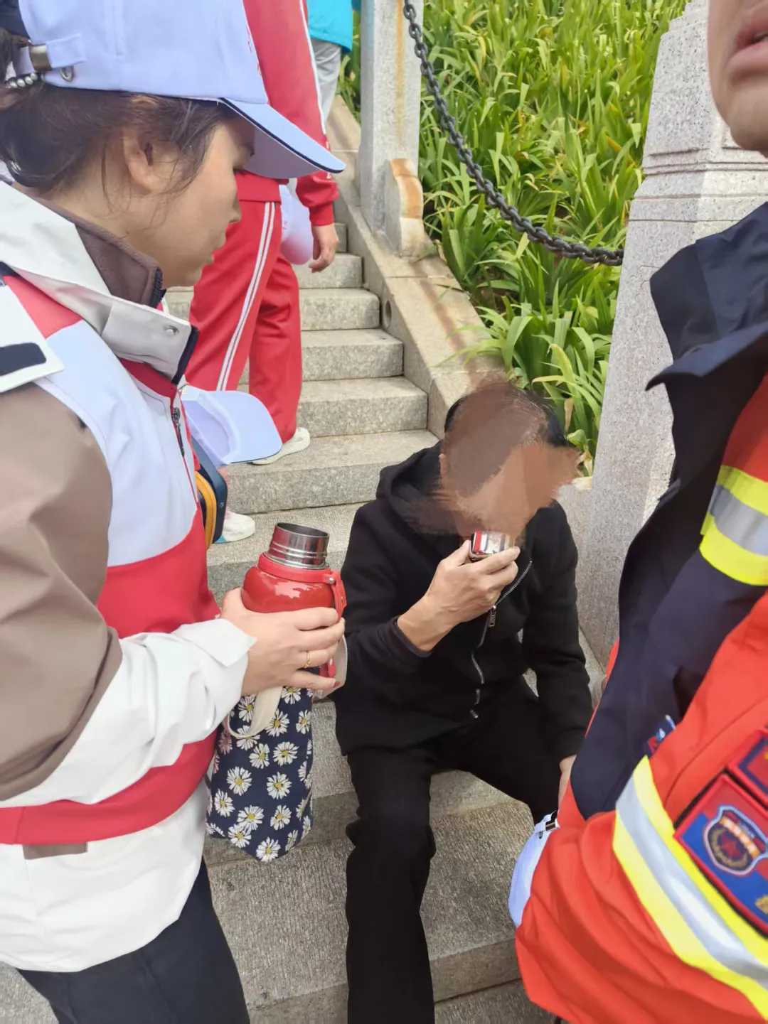 赛事进行中,一位女士和一位男士相继出现脸色苍白、双手颤抖等症状。救护师资张朝霞、王潇迅速抵达现场。经询问得知,老人因健步走速度较快且没吃早餐,出现低血糖症状。张朝霞为两位老人补充了糖水和面包,并安抚情绪。待老人症状缓解、指征平稳后,两位师资将老人转交现场医护人员,成功化解风险。